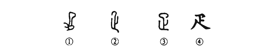 這個(gè)“疋”字讀作shū,本為象形字。甲骨文①就像一條小腿下連其足。“疋”與“足”,最初當是一個(gè)字。②是古璽文的形體,其下從“止”,詞義未變。③是小篆的寫(xiě)法。④為楷書(shū)的形體。