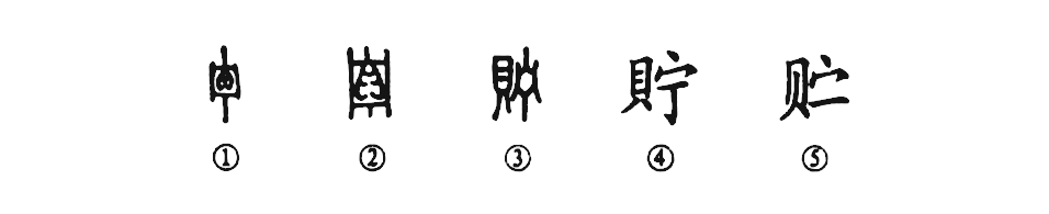 從甲骨文①的形體看,外部像是匣櫝一類(lèi)的容器,其內裝有“貝”,這就有貯(zhù柱)藏之意。金文②的形體與甲骨文類(lèi)似,只是其中的“貝”寫(xiě)得更復雜一些。小篆③把“貝”移于匣櫝之外,變成左形右聲的形聲字了。④是楷書(shū)的寫(xiě)法,直接由小篆楷化而來(lái)。⑤是簡(jiǎn)化字。