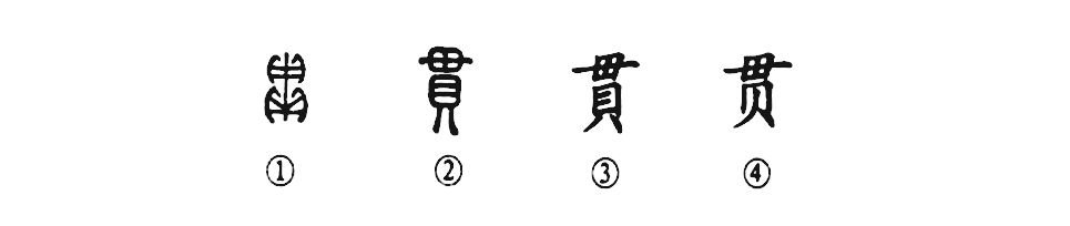 “每逢危棧處,須作貫魚(yú)行。”這個(gè)“貫”字本為象形字。①是金文的形體,用一條繩索穿著(zhù)一串貝。②是小篆的寫(xiě)法,變成了形聲兼會(huì )意的字了。③是楷書(shū)繁體字的寫(xiě)法。④為簡(jiǎn)化字。