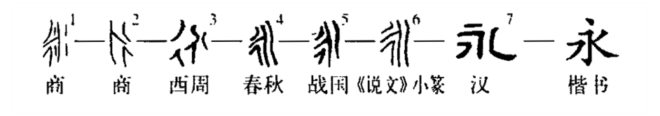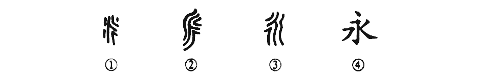 這個(gè)“永”字是個(gè)象形字。甲骨文①就像水的主流所分離出來(lái)的一條向右的支流。金文②就更像水流的形狀,潺潺溪水、涓涓不息。③是小篆形體,與甲、金文字的寫(xiě)法比較一致。到了楷書(shū)④,就變得看不出溪流的模樣了。