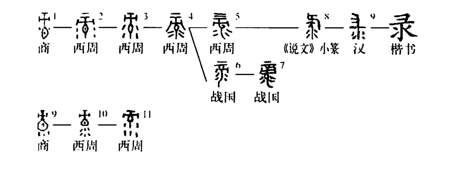 ”,象形意味稍有減弱?!墩f(shuō)文》小篆即從此字形演變而來(lái)。對于“錄”的造字本義,《說(shuō)文》:“錄,刻木錄錄也。象形。”未免解說(shuō)有誤。甲骨文假借為“山麓”之“麓”:“辛酉,王田于雞錄。”(《合集》37848)金文通用為“福祿”之“祿”。