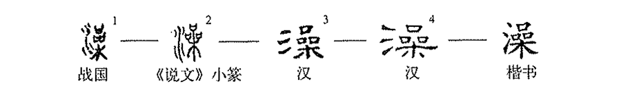 《說(shuō)文》:“澡,灑手也。從水喿聲。”許慎說(shuō)的“澡”字本義是正確的,但從甲骨文的形體看則為會(huì )意字,小篆變成了形聲字。