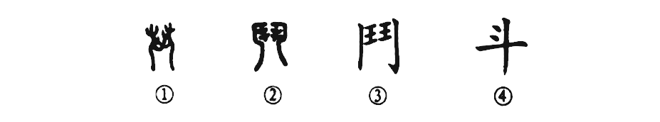 ?這是“斗爭”的“斗”字。甲骨文①是面對面的兩個(gè)武士,頭戴武士帽,伸著(zhù)手互相搏斗。②是小篆的形體,變得不像人形了。③是楷書(shū)的寫(xiě)法。④是簡(jiǎn)化字。