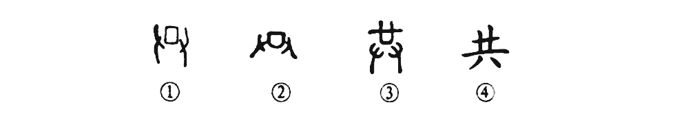 “但愿人長(cháng)久,千里共嬋娟。”這個(gè)“共”字本為會(huì )意字。①是甲骨文的形體,像左右兩只手捧著(zhù)一件物品。②是金文的形體,與甲骨文極為相似。③是小篆的寫(xiě)法。④為楷書(shū)的寫(xiě)法。