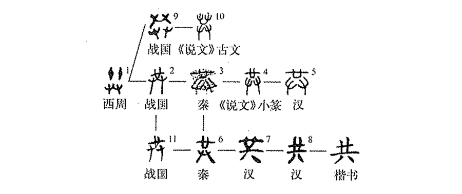 形聲字。從廿,??聲。 “廿”是兩個(gè)“十”并列,戰國文字連為一體。以?xún)蓚€(gè)“十”表示共同之意。《說(shuō)文》說(shuō)“共,同也。從廿??”,是合乎古文字的實(shí)際的。我們以為“??”在這里主要是表意作用?!墩f(shuō)文》古文當是由“共”逐步演變而來(lái),而不是《說(shuō)文》家所說(shuō)的從四手。古文字中另有字形作如下形體:
